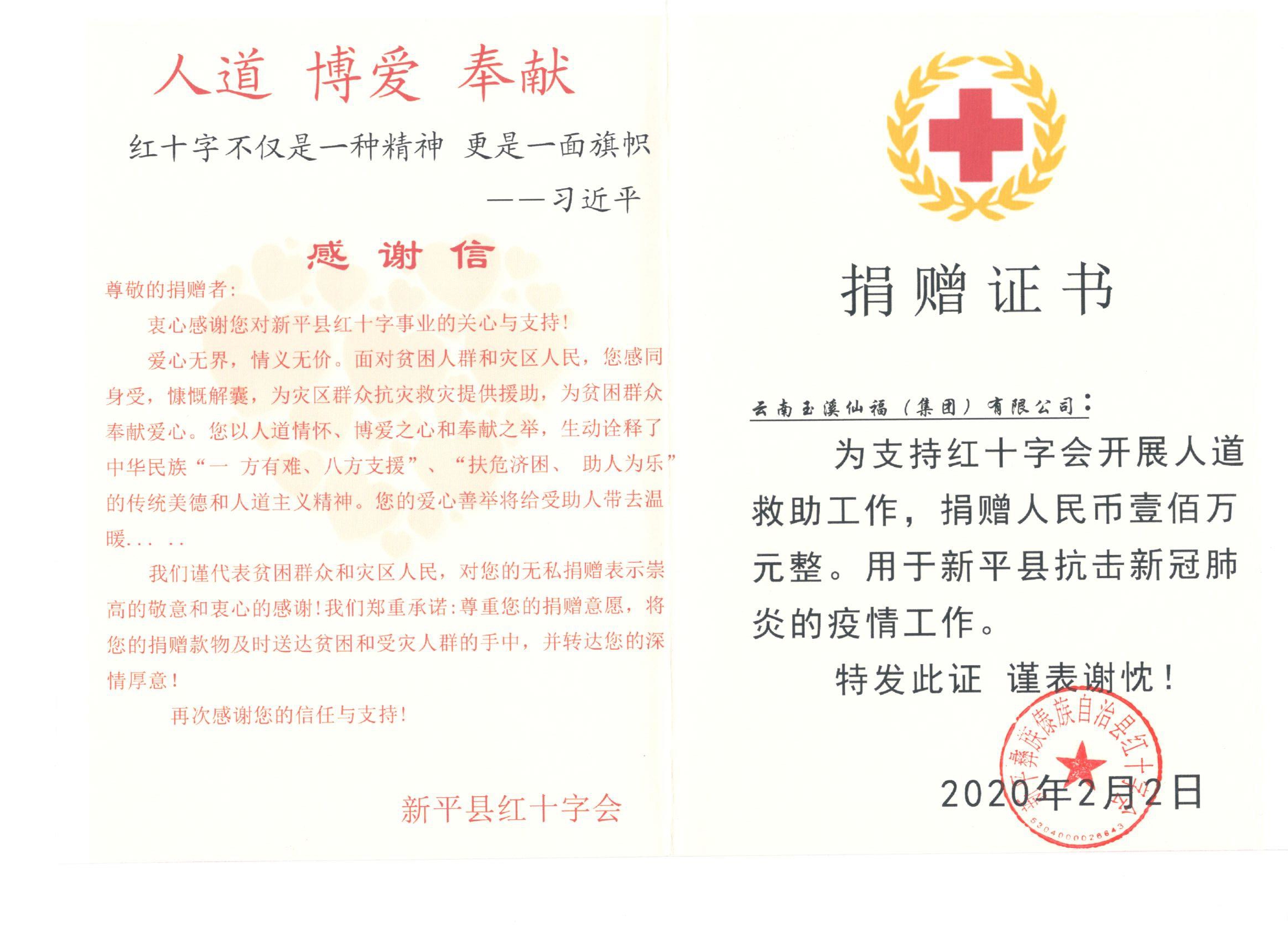 向新平縣紅十字會捐贈人民幣壹佰萬元整